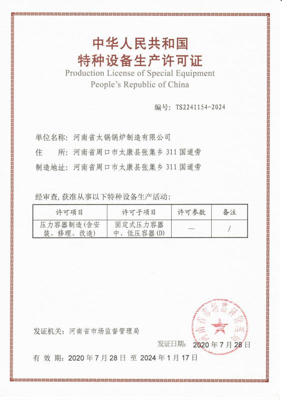 河南省太鍋鍋爐制造有限公司(原河南省太康鍋爐廠始建于1976年)始建于70年代初,經40多年的艱辛探索,靠科技興業,走科學管理之路,現已發展成為承接制造、安裝、設計大、中型供熱系統,生產:SZS燃油燃氣蒸汽鍋爐、燃煤蒸汽鍋爐、燃油鍋爐、燃氣鍋爐、電加熱鍋爐、生物質鍋爐、茶水鍋爐、有機熱載體鍋爐、熱風鍋爐,蒸壓釜、燃油蒸汽鍋爐、燃氣蒸汽鍋爐、燃油熱水鍋爐、燃氣熱水鍋爐并承擔安裝120噸熱水鍋爐、蒸汽鍋爐,生物質鍋爐,加工制造一、二類蒸壓釜、壓力容器,化工機械的省一級**企業。